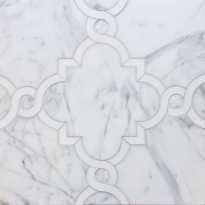 Waterjet stone mosaic, shown in honed Calacatta, polished Thassos and Shell