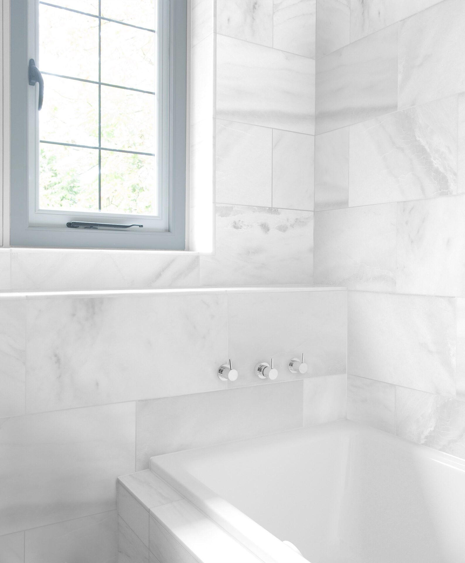 The subtle soft white background of Bianco Luna, punctuated with swaths of greys and warm veining, provides both a level of elegance and evokes feelings of relaxation.