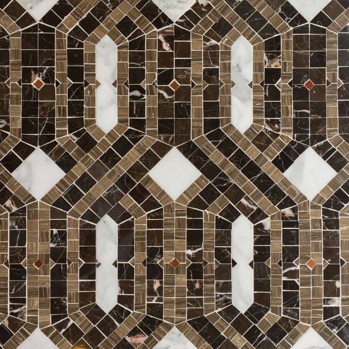 Honed Calacatta Oro (S18 and S19). Copper Gold Glass Mosaic (S17). Polished Dark Umber Mosaic 9/16” (S2, S4 ,S5 ,S7, S9, S11, S14, S16)