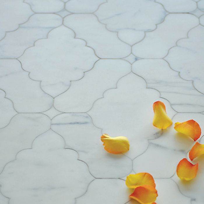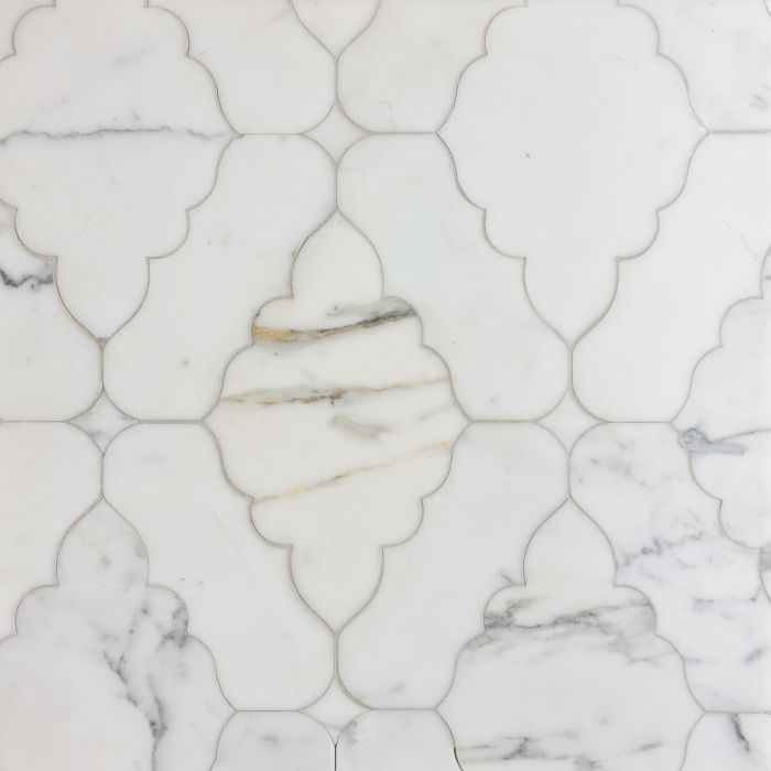 Waterjet stone, mosaic shown in Calacatta Tia and Bardiglio with a venetian finish