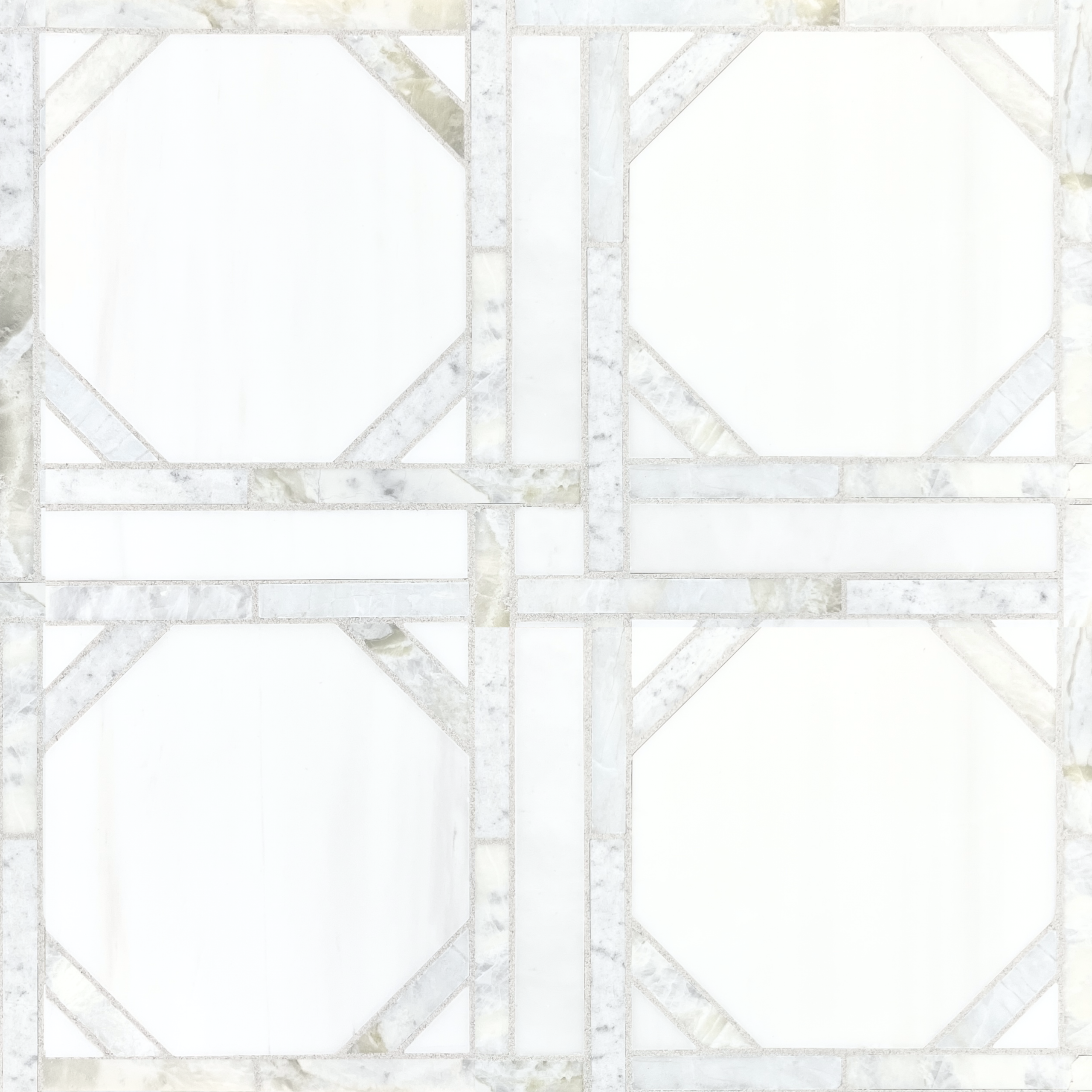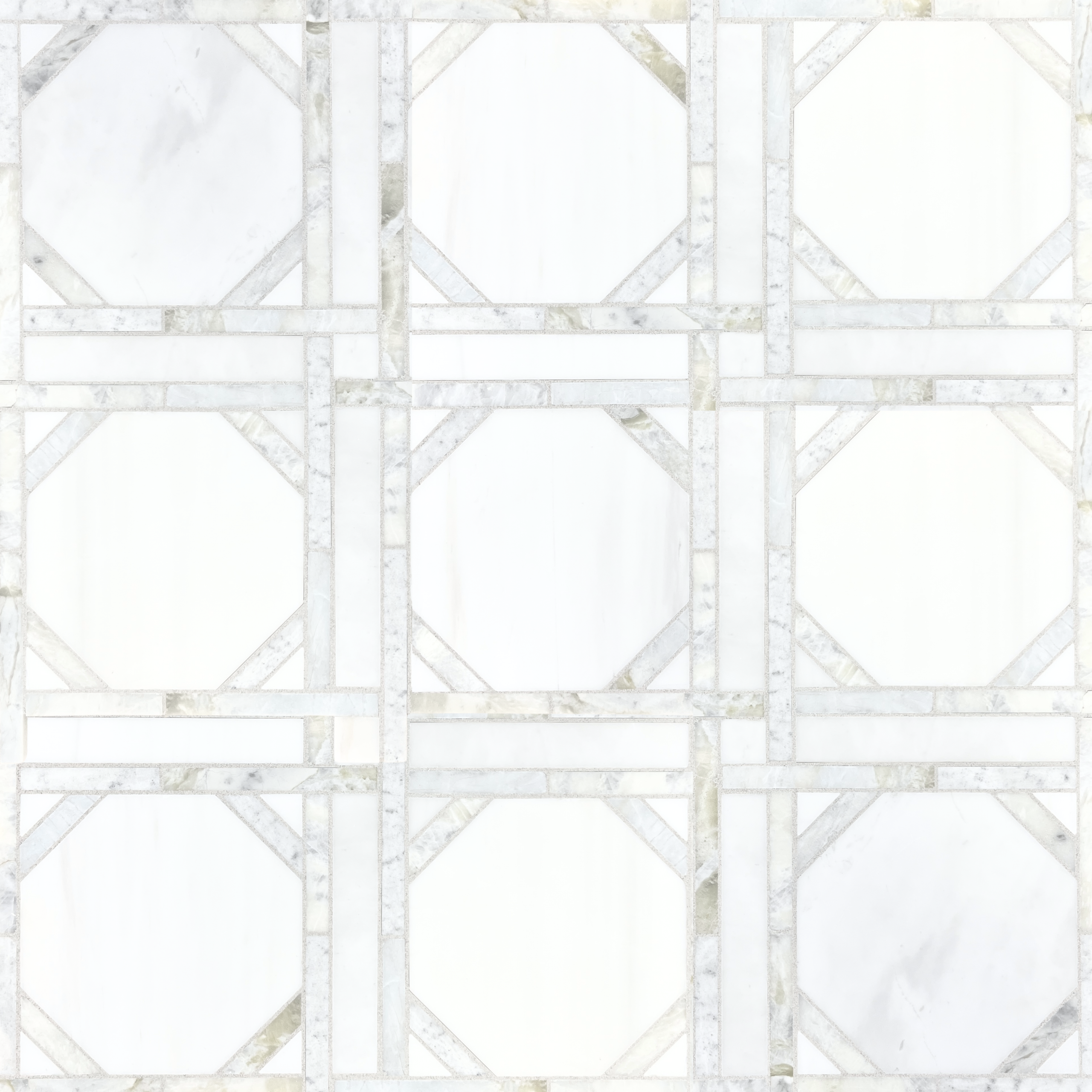 Elevate your interiors with the refined geometry and natural beauty of this honed marble waterjet mosaic. Artfully crafted from Carlyle White and Spring Mint marbles, this sophisticated design features crisp octagonal forms framed by precision-cut linear accents, creating a structured yet graceful pattern that feels both timeless and architectural.