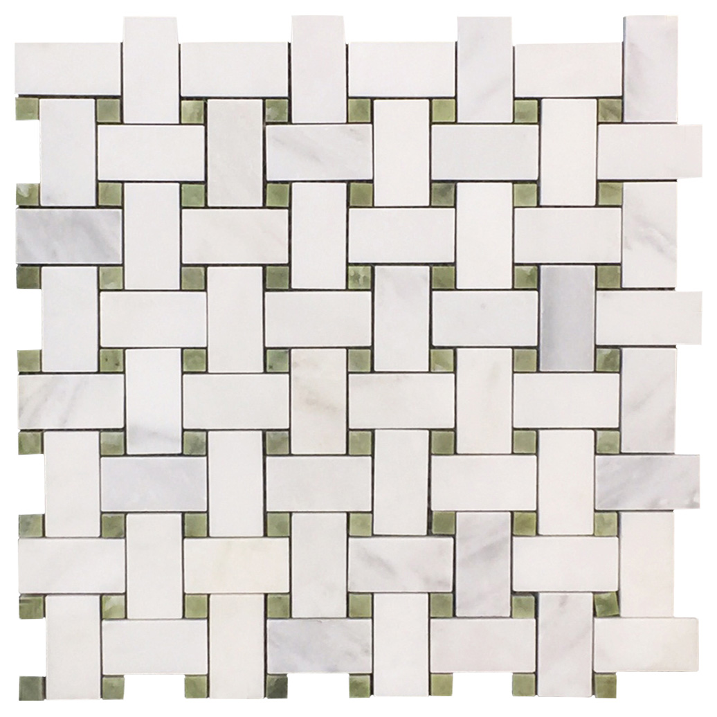 / White Statuary Calacatta | Basketweave Mosaic – w/ Green Olivine Dot | Polished