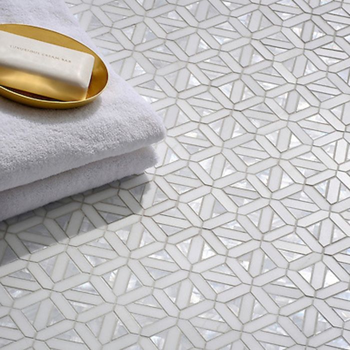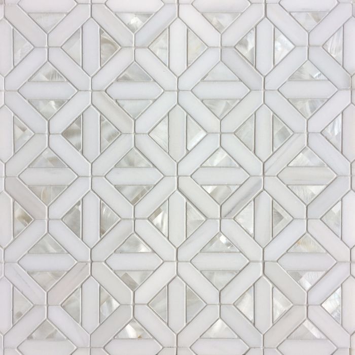 Handmade mosaic shown in polished Dolomite and Shell
