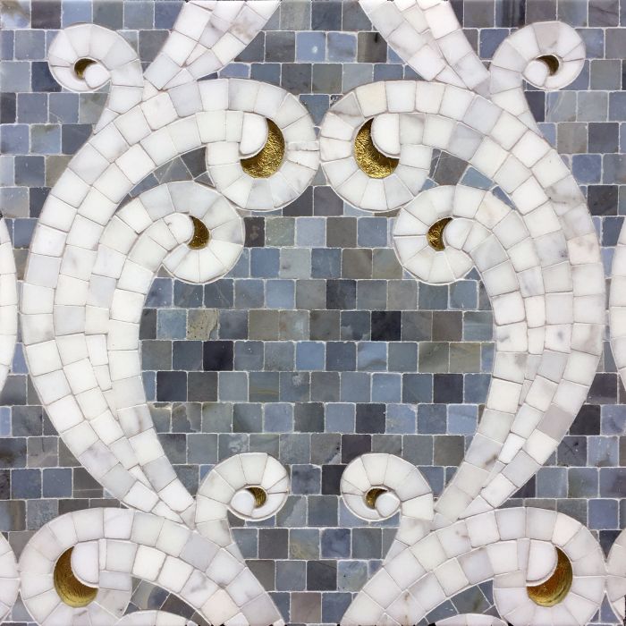 Calacatta Oro (Polished), Marino Blue (Honed), Gold Glass
