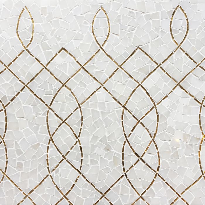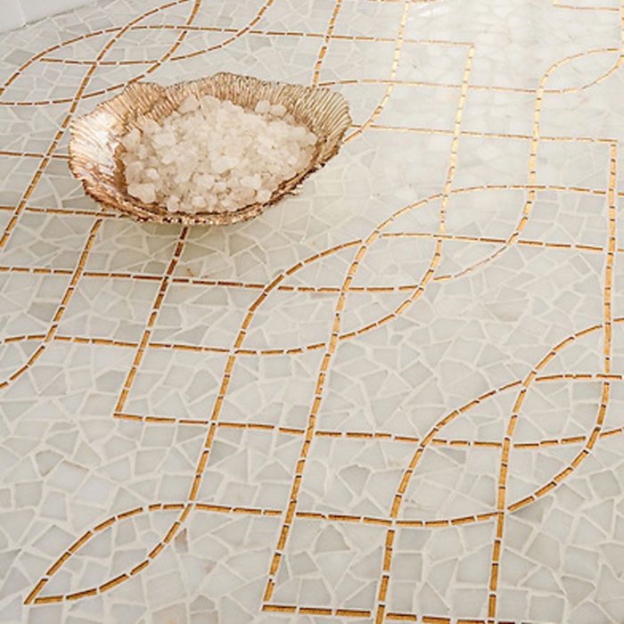 Hand-cut mosaic shown in Afyon White and 24K Gold Glass