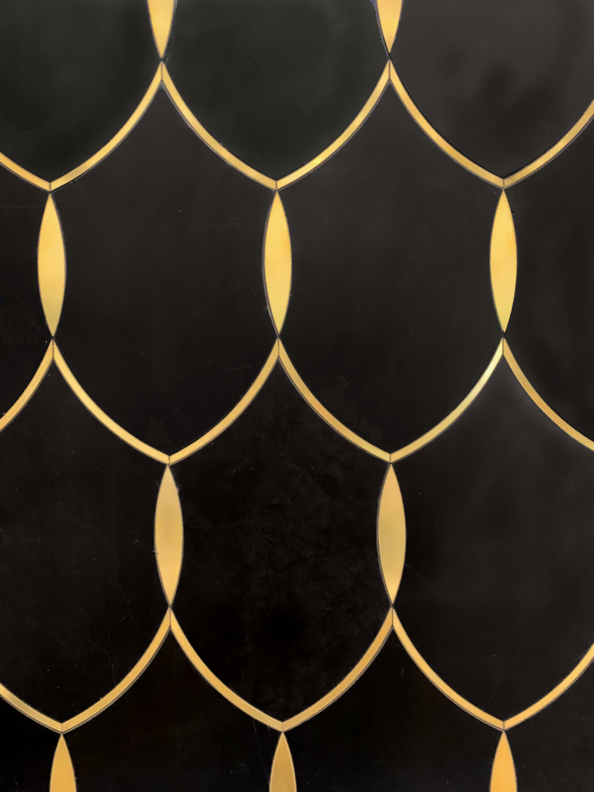 The Patine Collection is an elegant brass and marble mosaic tile.