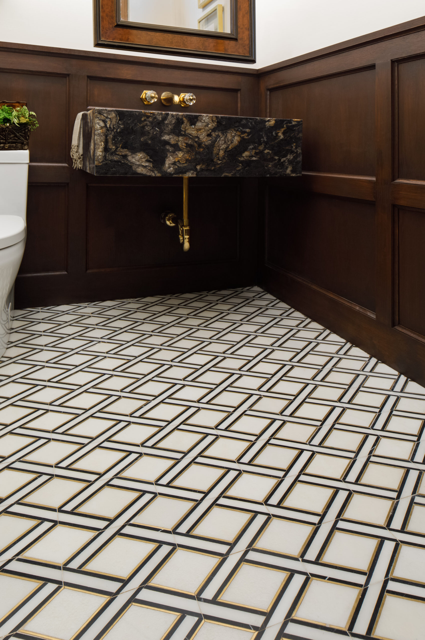 The Patine Collection is an elegant brass and marble mosaic tile.