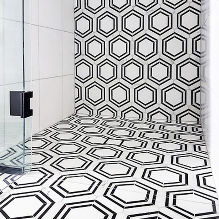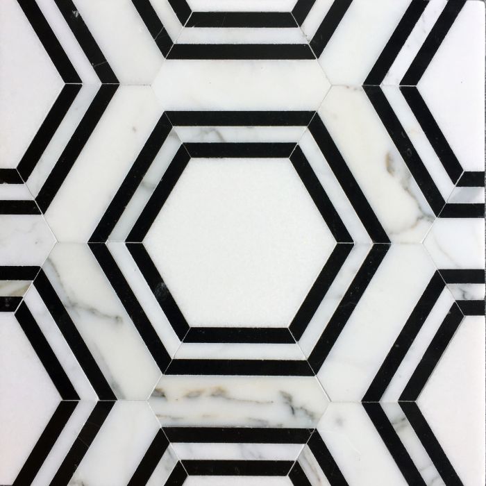 Stone waterjet mosaic shown in honed Calacatta, honed Thassos, and honed Nero Marquina