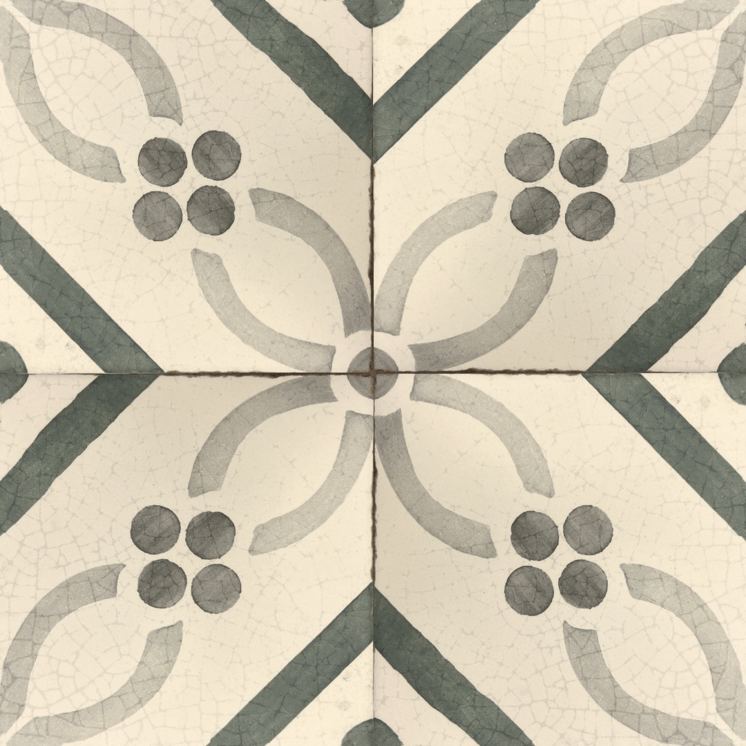 Rue Cler is a beautiful collection of hand-painted decorative porcelain tile with a crackle glaze that adds a unique and timeless finish. Available in a variety of deco patterns and solid crème or gris field. These 6×6 tiles are rated for both indoor and outdoor projects, and the perfect choice for creating unforgettable backsplashes, wainscoting, floors, pools and garden features.