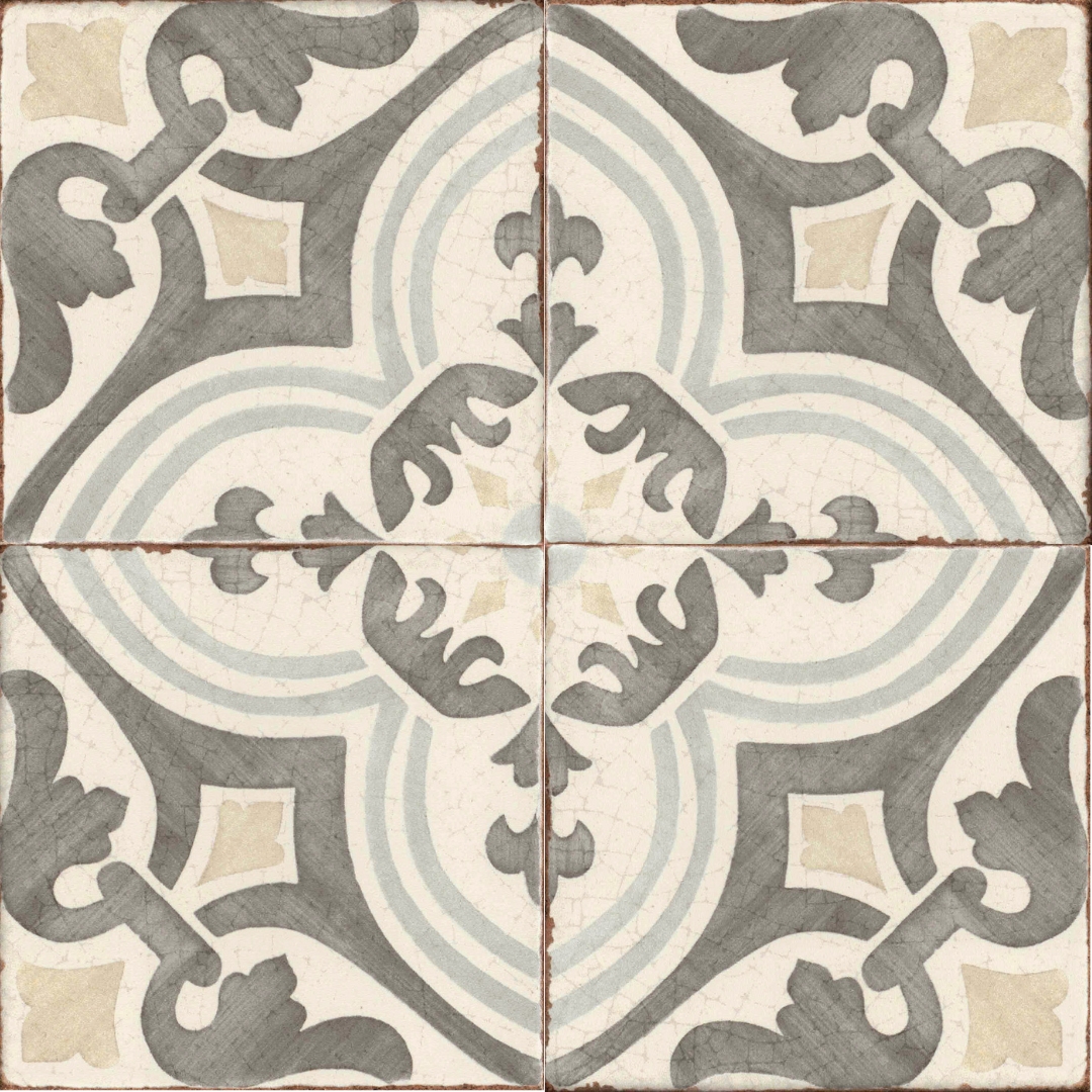 Rue Cler is a beautiful collection of hand-painted decorative porcelain tile with a crackle glaze that adds a unique and timeless finish. Available in a variety of deco patterns and solid crème or gris field. These 6×6 tiles are rated for both indoor and outdoor projects, and the perfect choice for creating unforgettable backsplashes, wainscoting, floors, pools and garden features.